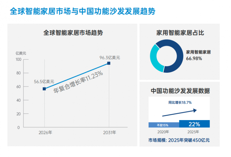 从数据看,智能家居赛道无疑是繁荣的。全球智能家居市场规模预计年.5亿美元增长年.3亿美元,中国功能沙发渗透率正年的不%年%爬升,2025年市场规模突亿元,同比增.7%。